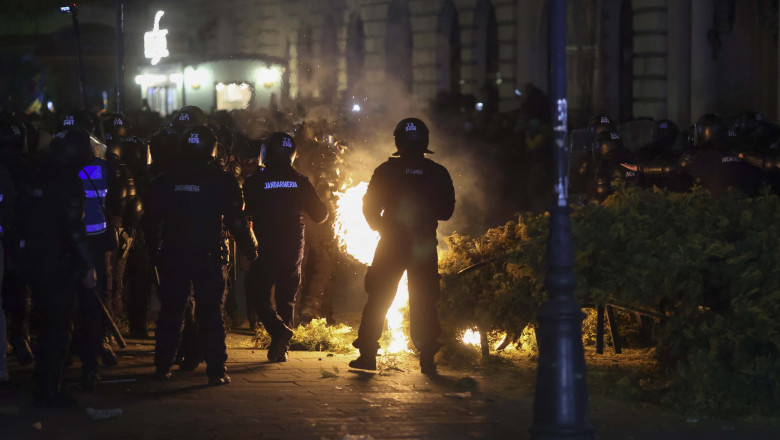 Scene violente au avut loc și în Centrul Vechi, unde manifestanții au început să arunce cu pietre, petarde și sticle în forțele de ordine, au dat foc la arbuști, coșuri de gunoi și au răsturnat o mașină a grupului DIGI.