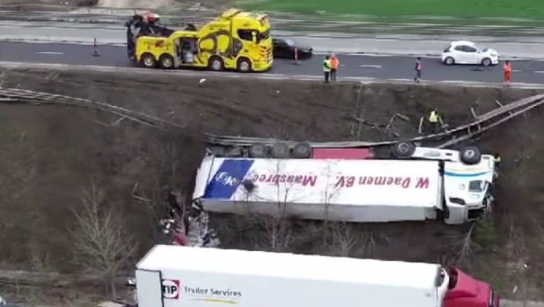 Traficul rutier pe şoseaua de centură a fost restricţionat vineri pentru operarea ridicării autotrenului care a derapat, a ieşit de pe şosea, a rupt parapetul şi s-a răsturnat. O macara a fost adusă pentru a ajuta la ridicarea vehiculului. Imaginile postate de Direcţia Regională de Drumuri şi Poduri (DRDP) Braşov arată că semiremorca a fost decuplată de capul tractor, iar acesta a fost ridicat și pus pe roţi cu ajutorul macaralei. Încărcătura a fost mutată într-un alt TIR.