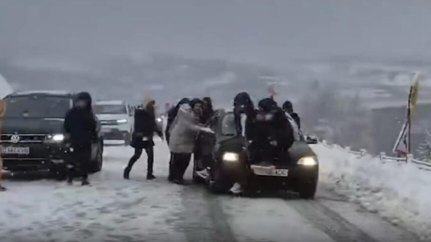 O situație alarmantă a fost surprinsă pe un drum acoperit de zăpadă, unde mai mulți tineri s-au urcat pe capota unei mașini, în timp ce alții o împingeau, în încercarea de a obține aderență. Această soluție extrem de periculoasă putea conduce la un accident grav.