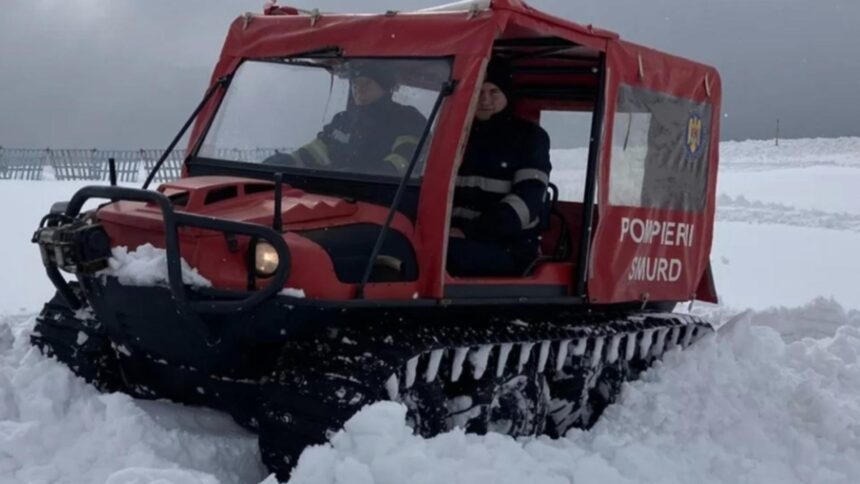 Un echipaj de primă intervenție, împreună cu un vehicul șenilat din cadrul Detașamentului de Pompieri Focșani, acționează în localitatea Dumitrești, județul Vrancea, pentru evacuarea unei persoane dependente de oxigen.