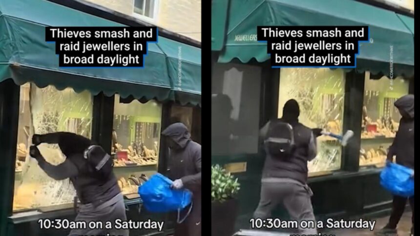 Sâmbătă dimineață, pe o stradă aglomerată din Richmond, vestul Londrei, doi hoți înarmați cu ciocane au spart vitrina magazinului de bijuterii Gregor & Co. și au fugit cu bunuri valoroase, în plină zi. Momentul a fost surprins de martori și s-a răspândit rapid pe rețelele sociale.